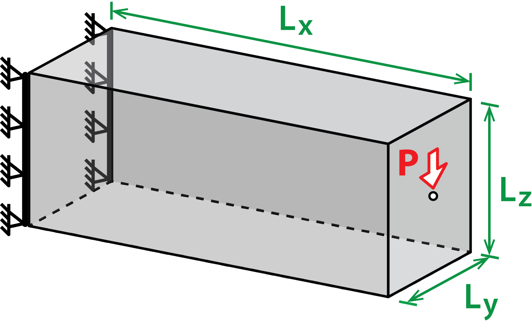 Rectangular cantilever domain suported along two vertical edges and loaded at the center of the facet opposite to the supports.