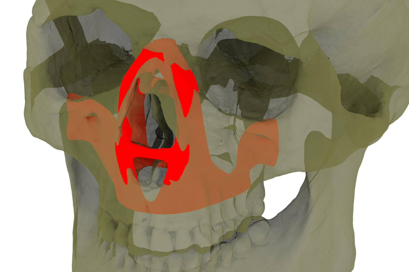 Topology optimized bone replacement for craniofacial trauma. The domain is patient-specific and procedurally-generated. Passive-void zones (not variables) for the eye, nasal and oral cavities are defined.